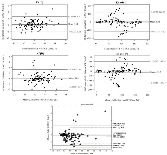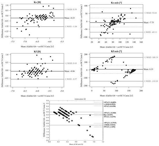 In the OCT Casia 2 and GalileiG6 Dual Scheimpflug Analyzer comparison, there were significant differences between devices for the total Ks axis (°). The difference is insignificant (p > 0.05), and the ICC is low (Table 1 and Figure 2).