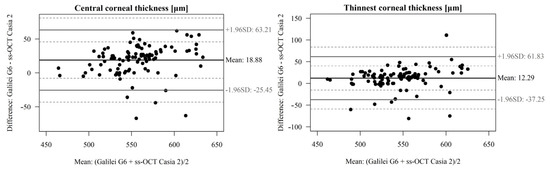 Backgrounds: To compare keratometry (Ks and Kf), astigmatism (Ast.), and the astigmatism axes (Ax.) of the posterior surface of the cornea; the total, central cornea thickness (CCT); and the thinnest corneal thickness (TCT) measured using two different measurement methods. Methods: Patients qualified for cataract surgery at the Chair and Clinical Department of Ophthalmology, Division of Medical Science in Zabrze, Medical University of Silesia, Katowice, Poland, were included in the study and monitored with the following two devices: OCT-CASIA2 and Dual Scheimpflug Analyzer GalileiG6. Our work was a randomized, prospective study in which compliance with the agreement of measurements between the devices was evaluated using the Bland–Altman method. Results: A total of 110 patients (62 females and 48 males) were examined. Overall, 100 eyes of patients that qualified for cataract surgery were enrolled in the study. No statistically significant difference was observed for Total-Ks and Total-Kf. A significant difference was observable for the following parameters: total Ks-ax, total Kf-ax, the total power of astigmatism, and in all parameters of the part of the cornea and corneal thickness (CCT and TCT). Conclusions: The measurements obtained using Casia2 and the Dual Scheimpflug Analyzer GalileiG6 were significantly different and not interchangeable except for total Ks and Kf.