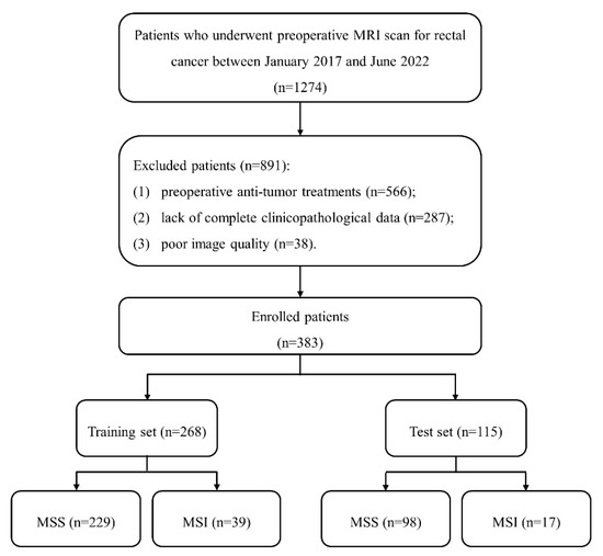 This retrospective study was approved by our institute review board, and written informed consent was waived. A total of 1274 patients with suspected RCs were included between January 2017 and June 2022. Inclusion criteria included: (1) pathologically proven RC; (2) received rectal MRI examinations one month before surgery; (3) no history of other malignant tumors. Exclusion criteria included: (1) preoperative anti-tumor treatments; (2) lack of complete clinicopathological data; (3) poor image quality caused by metal or motion artifact. Finally, 383 patients were enrolled and divided into training (n = 268) and test (n = 115) sets at a ratio of 7:3. The patient recruitment process is shown in Figure 1.