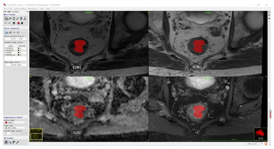 Before tumor segmentation, A.K. software (Analysis Kit, GE Healthcare, Hangzhou, China) was used to adopt T2WI as the template for the rigid registration of T1WI, ADC, and +C sequences to ensure that the four sequences contained the same resolution, spacing, and origin. The standardized T2WI images were imported into open-source ITK-SNAP software, and the whole rectal tumor was segmented slice-by-slice to determine the volume of interest (VOI) for each patient by a radiologist with 5 years of experience in rectum MRI. According to the registration of different sequences, T1WI, ADC, and +C can share the same VOI obtained from T2WI. Then, the segmentation results were validated by another radiologist with more than 10 years of experience using intraclass correlation coefficient (ICC) on a cohort of 30 randomly selected patients. The tumor segmentation procedure is shown in Figure 2.