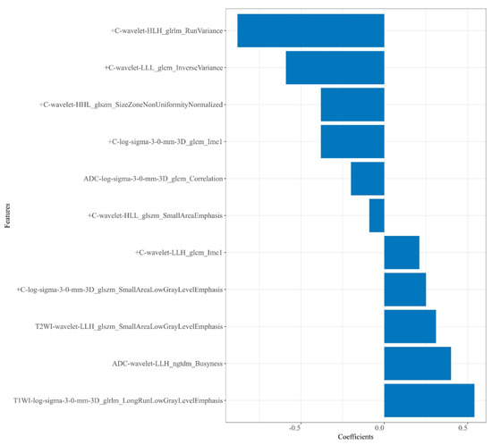 Plot of regression coefficients for retained radiomics features.
