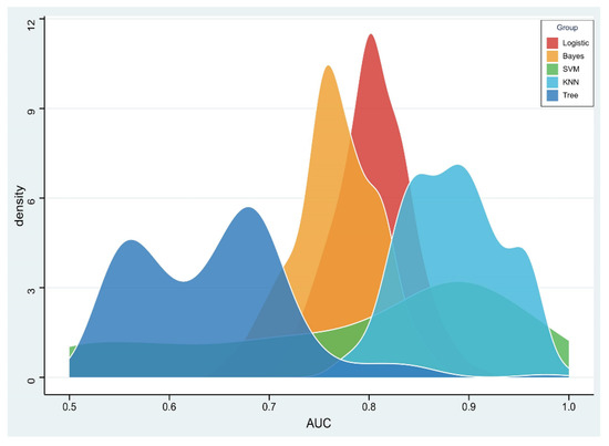 Density distribution of the area under the receiver operating characteristic (AUC) curve of radiomics constructed by five machine learning algorithms.