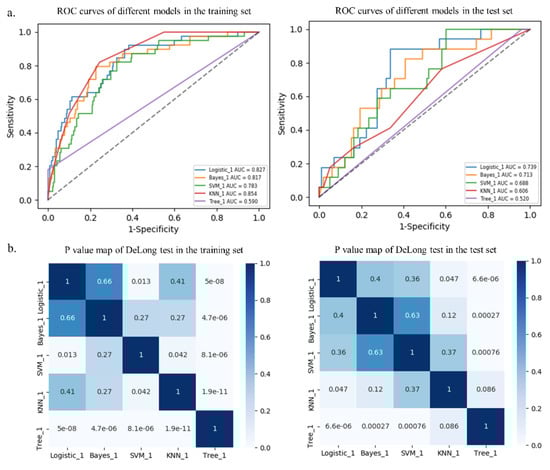 Receiver operating characteristic (ROC) curves of different models in the training and test sets (a). p value map of DeLong test in the training and test sets (b).