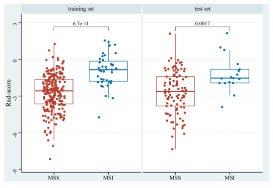 The boxplot of rad-scores of MSS and MSI in the training and test sets.