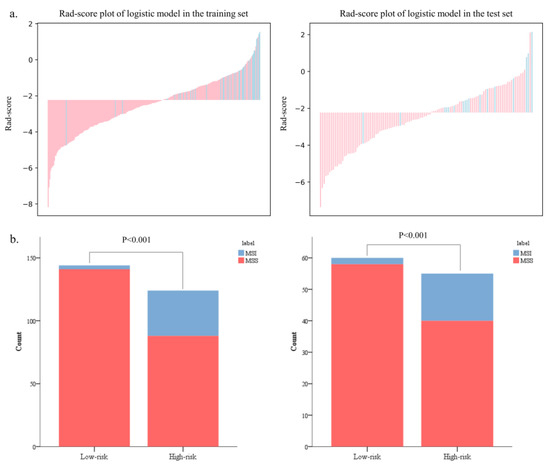 The Rad-scores in the MSI group were significantly higher than in the MSS group in both the training and test sets (p < 0.05, Figure 6). Red represents MSS, and blue represents MSI in the rad-score plot (Figure 7a). Patients with rad-scores greater than −2.260 were stratified into the high-risk group, and the others were stratified into the low-risk group. There were significant differences in the number of patients whose predicted MSI were between the low-risk and high-risk groups in both the training and test sets (p < 0.001), indicating the clinical applicability of the logistic model (Figure 7b).