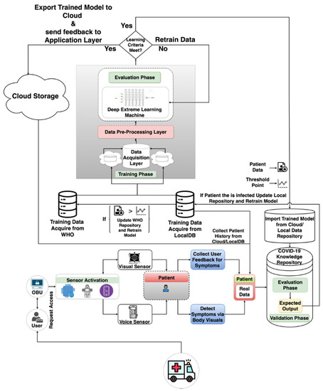 - A deep extreme learning machine (DELM) is applied for the dataset training process. The DELM carries the advantage of extreme learning as well as deep learning methodologies. The overall system process is illustrated in Figure 1. First, the data processing layer incorporates the input values; they travel to the neural network, where the framework has been trained to validate the dataset. Then, the DELM framework will train on data and export the trained model to the Cloud and send feedback to the validation phase for evaluation. The purpose of exporting the trained model to the cloud is to access it from anywhere.