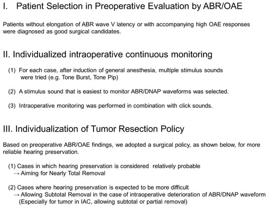 Based on our previous study, patients without elongation of ABR wave V latency or with accompanying high OAE responses were diagnosed as good surgical candidates [6]. In contrast, patients with elongation of the ABR wave V latency and poor OAE responses were diagnosed as not ideal surgical candidates. In this case, whether surgery should be performed depends on the patient’s requirement for hearing preservation surgery and the acceptance of the possibility of partial resection or hearing loss caused by surgical interventions.