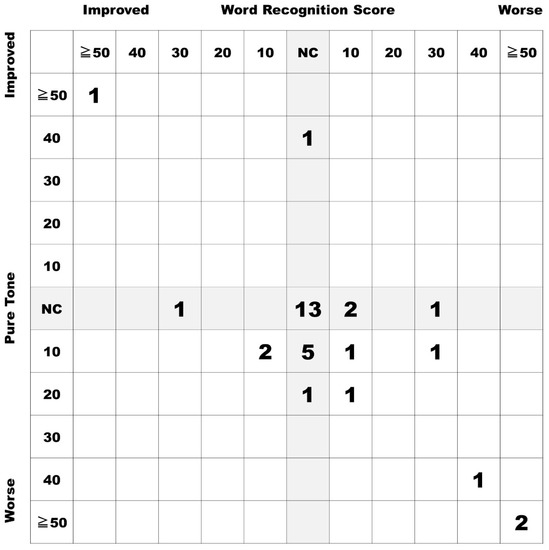 Thirty-three patients (13 males, 20 females) were included in this study. The average age of the patients at the surgery was 47.3 ± 13.7 years old. The average size of the tumors was 17.4 ± 5.7 mm (Koos Classification; I (N = 4), IIa (N = 18), IIb (N = 2), III (N = 8), and IV (N = 1)). In 26 of the 33 cases (79%), preservation of hearing equivalent to that before surgery or improved hearing was achieved (Figure 3). In five of the seven residual cases, some extent of hearing remained, and total deafness was present in only two of the 33 cases (6%).