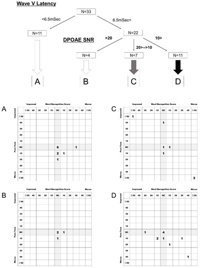 Next, the postoperative hearing results were analyzed based on the classification suggested in our previous report of ABR wave V latency and OAE (Figure 4). In class A patients, hearing preservation was achieved in nine of 11 patients (82%). In class B, four of four patients (100%) had preserved preoperative hearing levels. In class C, five of seven (71%) patients achieved hearing preservation, while two of seven lost hearing ability. In class D, eight of 11 patients (73%) had preserved hearing levels postoperatively.