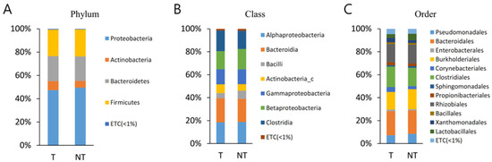 A total of 95 orders were identified, considering all OTUs defined. Bacteroidales, Burkholderiales, and Clostridiales were the top three most abundant orders and together comprised 62.5% of all sequences in MT. Bacteroidales and Clostridiales were the top two most abundant orders of BPH and together comprised 78.9% of all sequences. The most abundant order was Bacteroidales, accounting for 31.3% (MT) and 21.7% (BPH) of sequences. Burkholderiales was more abundant in MT than BPH (p < 0.05). Bacteroidales and Clostridiales were more abundant in BPH than MT (p < 0.05).
