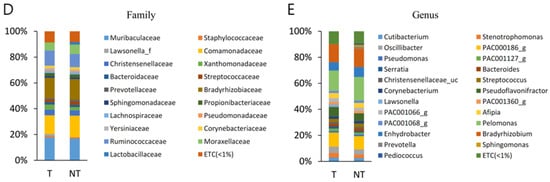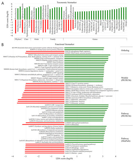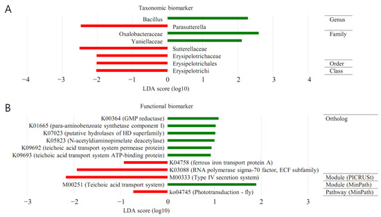 The forest plots were generated from the LEfSe analysis, which showed the most differentially abundant taxa enriched in microbiota with green for the BT group and red for the MT group (Figure 5). At the order level, Oceanospirillales was significantly enriched in BT samples (LDA score ≥ 2). At the family level, Sutterellaceae was significantly enriched in MP samples (LDA score ≤ −2). Oxalobacteraceae was significantly enriched in BT samples (LDA score ≥ 2).