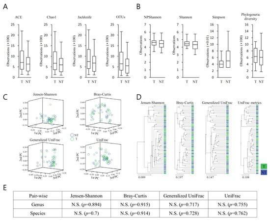 Alpha and beta diversity indices in malignant prostate cancer tissues (MT) and peri-malignant benign prostatic tissues (BT) of prostate cancer patients. (A) Species richness was analyzed with Ace, Chao1, Jackknife, and OTUs, (B) and the species diversity was analyzed with NPShannon, Shannon, Simpson, and phylogenetic diversity. The horizontal thick black band represents the median value, and the boxplot margins indicate first and third quartiles. None of the alpha diversity analysis results showed a significant difference. (C) Distances between communities were analysed by a principal coordinate analysis (PCoA). (D) Clustering using the unweighted pair group method with arithmetic mean (UPGMA) was analysed. (E) Beta set-significance was demonstrated by permutational multivariate analysis of variance (PERMANOVA). Beta diversity analysis was performed using Jensen–Shannon, Bray–Curtis, Generalized UniFrac, and UniFrac metrics. N.S., not significant.