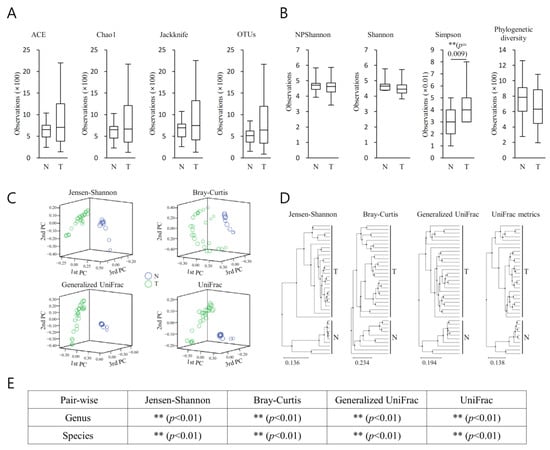 Alpha and beta diversity indices for benign prostatic tissue (BPH (N)) and tumour region in prostate cancer patients (MT(T)). (A) Species richness was analyzed with Ace, Chao1, Jackknife, and OTUs, (B) and the species diversity was analyzed with NPShannon, Shannon, Simpson, and phylogenetic diversity. The horizontal thick black band represents the median value, and the boxplot margins indicate first and third quartiles. (C) Distances between communities were analysed by a principal coordinate analysis (PCoA). (D) Clustering using the unweighted pair group method with arithmetic mean (UPGMA) was analysed. (E) Beta set-significance was demonstrated by permutational multivariate analysis of variance (PERMANOVA). Beta diversity analysis was performed using Jensen–Shannon, Bray–Curtis, Generalized UniFrac, and UniFrac metrics. Significance between the groups was mentioned as ** p < 0.01.