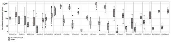 Cerebrospinal fluid and plasma concentrations of different antiretroviral drugs.
