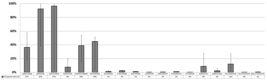 The CSF/plasma ratio (CPR) was calculated for each drug and expressed as a percentage: ABC and AZT showed the highest CSF-to-plasma ratios (CPR) (92% and 97% CPR, respectively), followed by 3TC, FTC and NVP (37%, 39% and 45% CPR, respectively). All the other drugs showed very low CPRs (Figure 2).