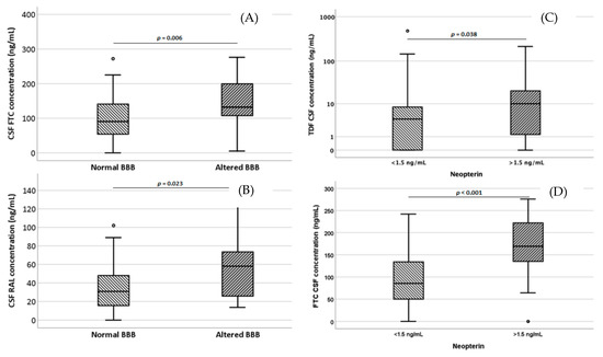 Cerebrospinal fluid according to an altered blood–brain barrier (A,B) and increased neopterin levels (C,D). FTC: emtricitabine, RAL: raltegravir, TDF: tenofovir. Circles indicate “out” values.