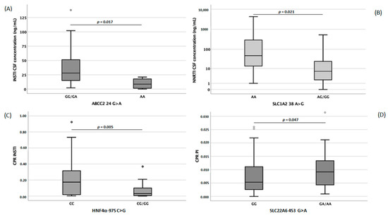 Cerebrospinal fluid (CSF, (A) for integrase inhibitors, INSTI and (B) for non-nucleoside reverse transcriptase inhibitors, NNRTI) and cerebrospinal fluid/plasma ratio ((C) for INSTI and (D) for protease inhibitors, PI) concentrations of different antiretroviral drugs according to single-nucleotide polymorphism.