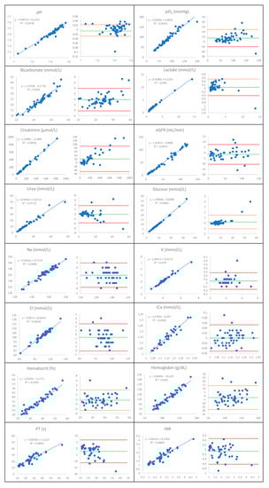 Passing–Bablok regressions of pH, partial pressure of oxygen (Po2), bicarbonate, lactate, glucose, sodium (Na), potassium (K), chloride (Cl) and ionized calcium (iCa), hematocrit and hemoglobin on the iSTAT Alinity (y axis) and ABL 90 Flex Plus (x axis) analyzers; creatinine, estimated glomerular filtration rate (eGFR) and urea on the iSTAT Alinity (y axis) and Cobas 8000 (x axis) analyzers and prothrombin time (PT) and international normalized ratio (INR) on the iSTAT Alinity (y axis) and ACL TOP analyzers (x axis). Bland–Altman plots of differences against means for patient samples (N = 49, except for creatinine and urea: N = 45, and PT and INR: N = 46) measurements with the iSTAT Alinity and central laboratories’ analyzers represented with the mean (dashed green line) and limits of agreement (dashed red lines) of the bias.