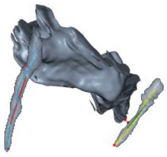 Moreover, from a bony point of view, as we analyzed only the osseous CT-windows (see Figure 4) (250–1000 Hounsfield Units), the mean distance between styloid and C1 is smaller in healthy people, counter intuitively and unexpectedly. A possible explanation could be as follows: styloid bone is surrounded by fibro-muscular tissue and continues in the stylo-hyoid ligament, not visible in the mentioned bony windows. Compression can result hence from the connective tissues around a vertical directed styloid, more than from the bone itself. This is a limitation in our software, shared also with mechanical models.