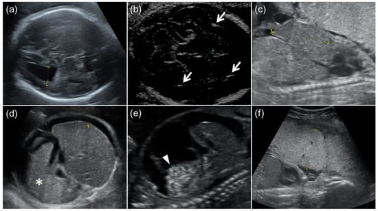 Fetal ultrasound findings of congenital cytomegalovirus (CMV) infection. (a) Moderate ventriculomegaly. The lateral ventricular atrial diameter at 31 GW was 1.3 cm. (b) Arrows indicate intracranial calcification. (c) Hepatomegaly. The fetal liver length at 24 GW was 4.2 cm (the reference value for 24 GW: ≤3.8 cm). (d) Splenomegaly and fetal ascites. An asterisk indicates enlarged fetal spleen, and the width of fetal ascites around the fetal liver was 0.8 cm. (e) Fetal ascites and hyperechoic bowel (arrowhead). (f) Placentomegaly. The placental thickness at 24 GW was 5.1 cm.