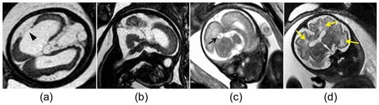 Abnormal magnetic resonance imaging findings in the brain of fetuses with congenital cytomegalovirus infection: (a) cortical malformation and schizencephaly (arrowhead); (b) vermian hypoplasia; (c) atrium pseudocyst (black arrow); (d) white matter hyperintensity (yellow arrows).