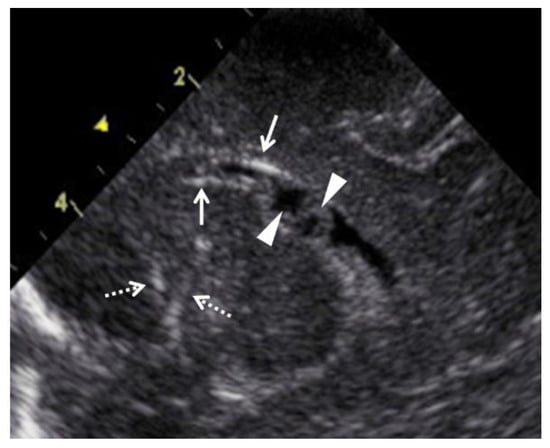 Abnormal ultrasound findings in the brain of newborns with congenital cytomegalovirus infection. Arrows indicate periventricular calcification, and arrowheads indicate pseudocysts in the cerebral ventricle. Dashed arrows indicate lenticulostriate vasculopathy.