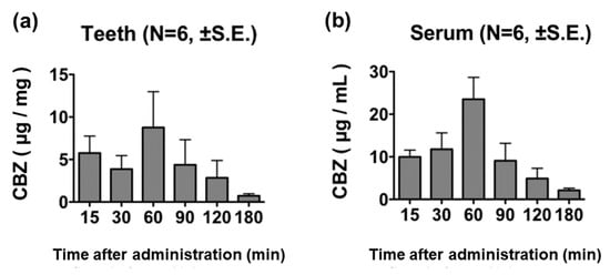 CBZ was detected in teeth 15 min after its administration, with its concentration peaking at 60 min post-administration and decreasing thereafter (Figure 2a). Serum CBZ concentration showed a similar trend in distribution, as observed with tooth CBZ concentration, and peaked at 60 min post-administration (Figure 2b).