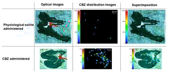 The MS images of the teeth of rats euthanized 60 min after receiving CBZ (100 mg/kg) showed a high distribution of the drug in the pulp cavity (Figure 6).