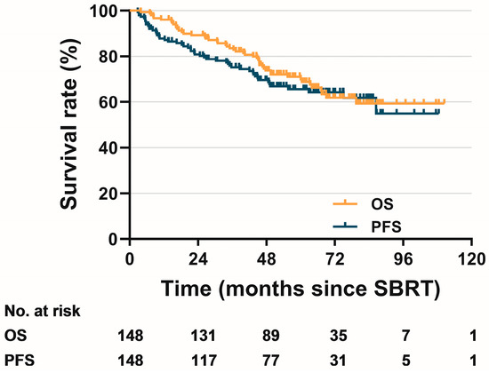 Between January 2013 and August 2018, 148 eligible patients were enrolled for further analysis with male patients accounting for the majority (72%). The median age of the entire cohort was 76 years (range 47–89 years). In 48 patients (33%), histology was adenocarcinoma; in 27 (18%), it was squamous cell carcinoma; in 21 (14%), it was NSCLC, not otherwise specified; and the remaining patients (35%) refused to provide biopsies. A total of 150 patients (78%), involving those having no pathological affirmation, received PET/CT examination before SBRT. The tumor in 129 patients (87%) was clinical stage T1, and in 19 (13%), it was T2. The median total dosage, dose-per-fraction, and BED10 of SBRT were 50 Gy (range 50–70 Gy), 10.0 Gy (range 7.0–12.5 Gy), and 100 Gy (range 100–132), respectively.