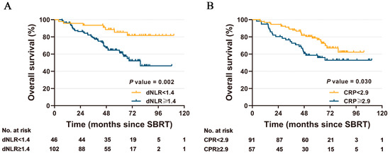 Multivariable analysis showed that, only dNLR ≥ 1.4 and CRP ≥ 2.9 continued to be statistically and independently linked to worse OS (HR = 4.62, 95% CI 1.89–11.27, p = 0.001; HR = 2.92, 95% CI 1.49–5.70, p = 0.002, respectively) when accounting for age, gender, Eastern Cooperative Oncology Group performance status (ECOG PS), Charlson comorbidity index (CCI), pulmonary function, smoking status, tumor pathologic type, T-stage, and BED10 (Table 2). The 5-year OS for patients with dNLR below and equal to or above the 1.4 were 85.3% and 62.9%, respectively (p = 0.002; Figure 2A), and 76.7% for the low CRP group versus 58.5% for the high CRP group (p = 0.030; Figure 2B). There was no statistically significant association of pre-treatment dNLR ≥ 1.4 with LRR (p = 0.791), DM (p = 0.069) or PFS (p = 0.100) (Tables S1–S3). However, CRP ≥ 2.9 remained independent significant parameters for inferior LRR (HR = 17.17; 95% CI 5.56–53.08; p < 0.001), DM (HR = 1.97; 95% CI 1.04–3.72; p = 0.038), and PFS (HR = 3.13; 95% CI 1.63–6.01; p = 0.001) (Figure S3).