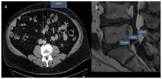 Obese patient (45 years old, male, BMI = 31 kg/m2, dyslipidemia). Association between SEL and visceral fat deposition: CT of the abdomen (Panel A) reveals increased visceral fat deposition (AP diameter 14 cm), while lumbosacral MRI sagittal T1w (Panel B) reveals SEL grade 2: moderate (dural-sac/epidural fat index = 0.46).