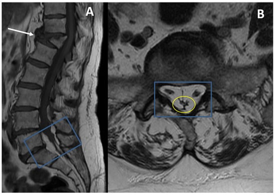 A 72-year-old woman affected by dyslipidemia, obesity, and high blood pressure underwent follow-up MRI control for a vertebral fracture (T12); patient complained about chronic lumbar pain, which worsened after the fracture, and bilateral sciatica. (A) Sagittal T1-weighted imaging (WI); (B) axial T1-WI. A marked vertebral body collapse of the T12 vertebra is detectable (white arrow). Moreover, a condition of SEL at L5-S1 level (blue rectangles) with compression of the thecal sac resembling the letter “Y” (yellow oval) is found.