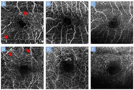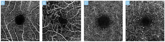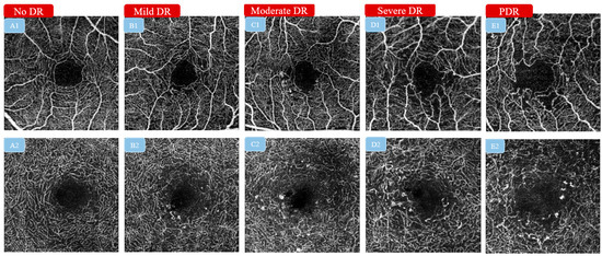 Optical coherence tomography angiography (OCT-A), as the functional extension of structural optical coherence tomography (OCT), is a novel imaging modality that can provide high-resolution and depth-resolved angiographic flow images by utilizing motion contrast [1]. With the advantages of being non-invasive and more readily available, OCT-A has opened a wealth of possibilities for investigating different types of vascular damage, such as diabetic retinopathy (DR) [2], age-related macular degeneration (AMD) [3], glaucoma [4], and retinal vein occlusion (RVO) [5], as it enables the assessment of microvasculature alterations in different vascular plexuses of the retina and optic nerve head. Taking DR as an example, previous studies have validated OCT-A as an alternative to fluorescein angiography (FA) for the assessment of DR-related pathological features, such as microaneurysms, capillary non-perfusion, and neovascularization [6]. Furthermore, quantitative OCT-A metrics, such as vessel density and foveal avascular zone (FAZ) area, have been correlated with the severity of DR (Figure 1) and visual acuity (VA) [7,8,9]. Longitudinal studies found that these quantitative metrics can help to predict DR progression and diabetic macular edema (DME) development [10,11]. With its reliable capacity for disease detection and prediction, the uptake of OCT-A in clinics has been sustainably growing.