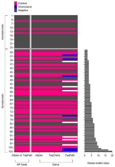 Heat map showing the RT-PCR results for detecting SARS-CoV-2 in paired NP swab and saliva samples, obtained from asymptomatic patients (contactors or not) and symptomatic patients with collections performed after different days of symptoms. Positive tests (pink), negatives (black), inconclusive (blue), and not tested (white). Abbreviations: RT-PCR: reverse transcription–polymerase chain reaction; NP: nasopharyngeal.