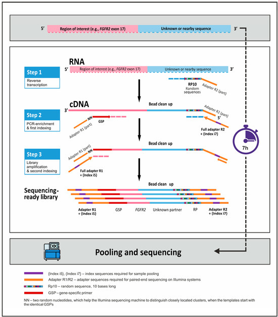 Anchored multiplex PCR methods are able to detect translocation with an unknown partner gene only if the breakpoint positions in at least one of the genes participating in the translocation are well defined [17]. They are generally more rapid and less expensive when compared with hybridization-based NGS library preparation protocols. PCR enrichment takes only about 2 h, whereas hybridization requires overnight incubation. Anchored multiplex PCR panels usually focus on a relatively narrow number of genomic segments and, therefore, they are smaller than hybridization-based NGS tests. Additionally, fewer NGS reads are required to achieve sufficient coverage in each region of interest and more samples can be multiplexed for each run when PCR enrichment is utilized. The most commonly used anchored multiplex PCR methods require the RNA to be converted to double-strand cDNA, followed by the adapter ligation, PCR enrichment, and final amplification of the libraries [17]. On the basis of this approach, two popular commercial NGS solutions were developed, namely Archer FusionPlex (ArcherDX, Boulder, CO, USA) and QIAseq RNAscan (Qiagen, Hilden, Germany). Multiple studies have relied on the use of these kits, thus supporting the feasibility of the anchored multiplex PCR method [21,22,23,24]. Alternatively, the adapter sequence can be attached to the cDNA molecules by the reverse transcriptase; this procedure is utilized in the template-switch-based 5′ rapid amplification of cDNA ends (5′ RACE) or the 3′ rapid amplification of cDNA ends (3′ RACE) protocols [25,26]. The 5′ RACE technique can be used when all the known translocation partners are located at the 3′ part of the chimeric transcripts, whereas the respective unknown partners are located at the 5′ part of the chimeric transcripts. On the other hand, 3′ RACE can be utilized only if all the unknown translocation partners are expected to occupy the 3′ ends of the mRNA. Importantly, the 3′ RACE- and 5′ RACE-based approaches allow for simple and straightforward in-house design of the custom RNA NGS tests.