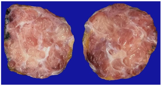 Gross image of an abdominal tumor corresponding to myxoid endometriosis. Note the presence of fibrous septa framing the myxoid areas.
