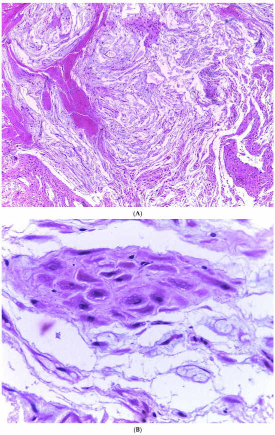 Formerly known as myxoid malignant fibrous histiocytoma, myxofibrosarcoma is considered one of the most common fibroblastic sarcomas in the elderly, mainly affecting patients between 60 and 80 years of age. It is a unique subtype of soft tissue tumors, characterized by a diffuse infiltrating pattern, represents approximately 5% of the diagnoses of sarcomas in soft tissues, and was originally described in 1977 as a multilobulated tumor, with myxoid characteristics on the cut surface. Microscopically, a hypocellular myxoid neoplasm is observed, with myxoid areas containing spindle cells, sometimes pleomorphic. The vascular network is evident, and in the more cellular areas, mitosis is common. Sometimes, myxoid areas contain “pseudo-lipoblasts” and epithelioid cells that grow diffusely, conferring a more aggressive behavior of the neoplasia. There are no specific immunohistochemical reagents for this tumor; it can be positive for vimentin and CD34 and negative for S100 [17].
