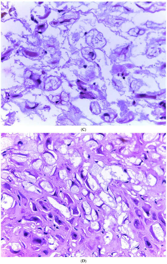 The term “myxoid” was introduced by Rudolph Virchow in 1858 to describe soft tissue tumors resembling the umbilical cord’s structure. The concept of myxoid tumors led to the recognition of various new tumors, including myxadenoma, myxochondroma, myxofibroma, and myxoneuroma. Today, myxoid changes are described in areas identified in both benign and malignant neoplasms, as well as in non-neoplastic (reactive) lesions [12]. Advancements in the study of the myxoid extracellular matrix introduced the alcian blue histochemical staining in 1950, which allowed for the distinction between different glycosaminoglycans (GAGs) in tissues. GAGs are macromolecules present in the pericellular and extracellular matrix and form proteoglycans once covalently attached to specific nuclear proteins [13].
