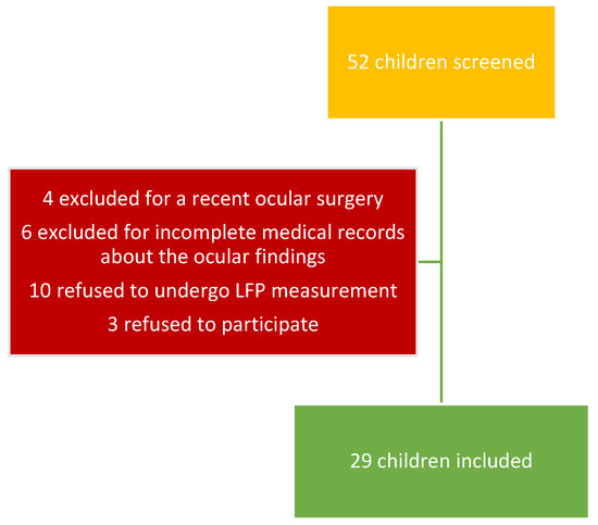Children enrolled in the study underwent a standard ophthalmology visit that included evaluation of visual acuity, intraocular pressure measurement, SLE, fundoscopy, complication evaluation, and LFP measurement. SLE was performed, independently, by an expert ophthalmologist (RP), while LFP was performed, blinded, in all the patients, by the same ophthalmologist (CdL) along with always the same technician (GD), as a part of the routine ophthalmological examination at each visit since the enrolment.