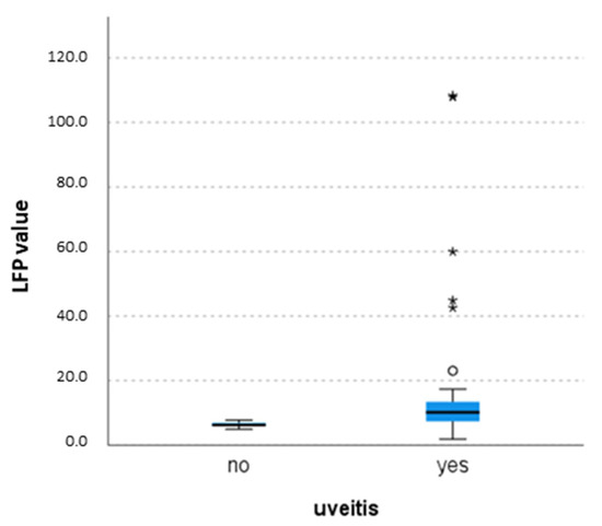 In accordance with recent studies, our study showed significantly increased LFP values in patients who showed structural complications such as cataracts and posterior synechiae, in a consistent way, regardless of inflammatory status [9,10,14,15,21,23,24]. In our cohort, we further showed a persistent correlation between LFP values and AC cells, even though there were complications. This seems in accordance with previous data reported not only in a large adult cohort such as Gonzales et al., but also in pediatric cohorts by Holland et al., Davis et al., and Yalcidang et al. [8,9,13,15].
