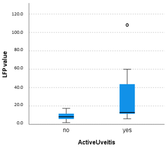Analysis of LFP values in children with uveitis were then stratified according to uveitis activity and type of uveitis, based on SLE evaluations. At the first LFP assessment, the LFP median values of the eyes of subjects with active uveitis (15 eyes) were significantly higher when compared to the LFP median value of subjects with inactive uveitis (35 eyes), being 12.8 IQR 11.4–44.8 versus 8.7 IQR 5.8–12, p = 0.002 (Figure 3). We did not observe a significant difference in the LFP measures regarding the type of uveitis: JIA-U and idiopathic uveitis LFP values were not different (Kruskal–Wallis test, p > 0.05).