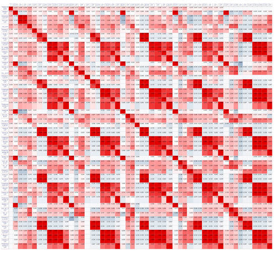 Chromatic covariation matrix of the correlations performed. The red color represents higher coefficient of correlation, while blue represents lower coefficient of correlation. List of abbreviations: SLE slit lamp evaluation, AC: anterior chamber cells, LFP laser flare photometry, N number, CCS Corticosteroid, VG LFP: value of LFP, Visual Acuity: visual acuity expressed in LogMar as a continuous variable, BCVA: best corrected visual acuity stratified as normal < 0.4, impaired 0.4–1, blindness > 1. The commas reported in the present figure should be considered as separator of decimal numbers.