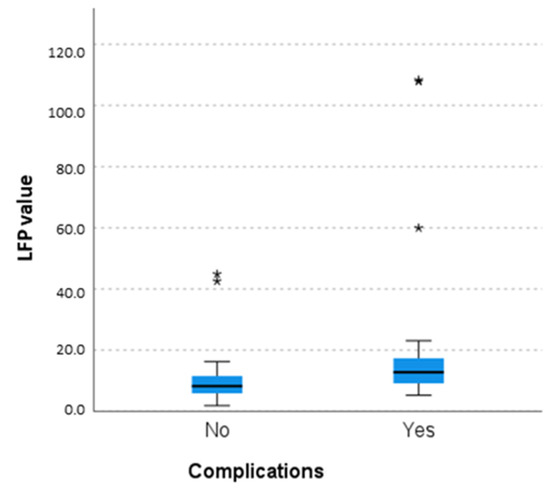 Indeed, eyes which had complications showed higher LFP values compared to eyes which did not show complications at baseline (25.94 ± 33.31 vs. 10.01 ± 8.44, p < 0.001) (Figure 5), at the second measurement (22.044 ± 21.9 vs. 8.83 ± 4.62, p < 0.001), at the third measurement (22.077 ± 20.8 vs. 10.69 ± 5.56, p 0.003), at the fourth (21 ± 19.13 vs. 10.68 ± 6.19, p = 0.016), and at the last available follow-up too (30.33 ± 31.24 vs. 11.06 ± 8.07, p = 0.002).