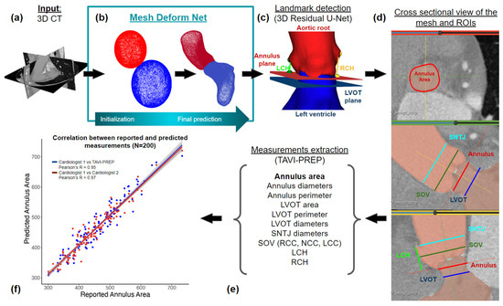 Figure 1. Workflow of measurement extraction from a clinical CT scan. (a) 3D phase specific CT scan, usually taken at 30% of the cardiac cycle. (b) The segmentation module, as proposed by Kong et al., allows the creation of an accurate anatomical representation of a patient’s anatomy in the form of a mesh. Spherical meshes are deformed to closely math the anatomy. (c) Landmark detection step, where the position of the coronary ostia and the three nadirs’ commissures is obtained. This step defines the annulus and LVOT plane position and the left and right coronary height (LCH and RCH). (d) The 2D cross sectional views, taken from the 3D mesh representation, used to derive measurements. (e) List of measurements extracted by the proposed algorithm. (f) Correlation plot between the expected and reported measurements for the annulus area [23].