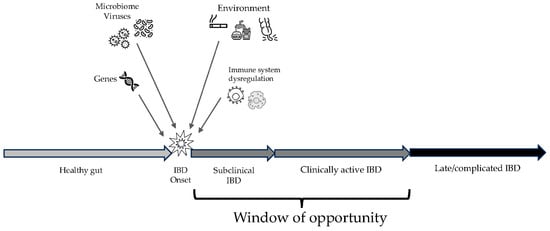 When chronic inflammation starts in the affected gut, this process may take time to result in clinically significant manifestations of IBD. Therefore, there could be a time lag between the onset of inflammation itself and the onset of symptoms and signs that could lead to a proper and timely diagnosis. This subclinical inflammation is actually hard to find and treat and can sometimes lead to bowel damage even before becoming clinically active [15]. If clinically active inflammation is diagnosed before evolving into complications, there is the possibility to manage and treat the disease within the so-called window of opportunity, when the probability of success of any intervention is the highest possible [1,16].