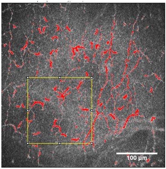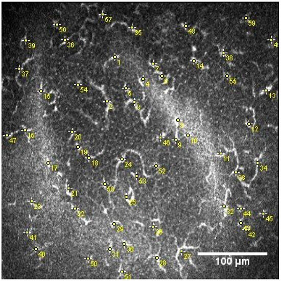 The DCs, identifiable in the sub-basal nerve plexus from their distinctive characteristics (bright cell bodies with dendritic structures), were manually numbered using the multipoint tool of the Image J software and then the DC density (cells/mm2) was calculated, as shown in Figure 1. In the DC quantification process, the image contrast was modified to make the hyperreflective bodies of these cells more visible [25].