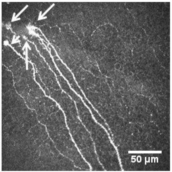 Corneal sub-basal nerve plexus with visible microneuromas marked by with arrows.