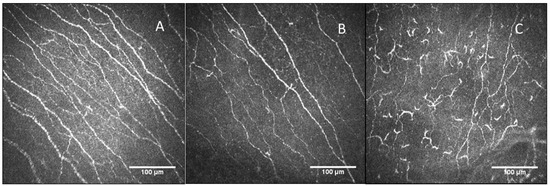 The examination was performed under topical anesthesia. (Colircusí Anestésico Doble®; Alcon Laboratories Inc., Barcelona, Spain). The RCM was set in “volume mode” to record a video of the different corneal layers down to a depth of 80 μm. Then, at least three nonoverlapping scans were obtained, from the epithelium to the anterior stroma at 80 μm depth using volume scans. The video with the least artifacts was selected for evaluation. The selected video was automatically converted into a series of two-dimensional images. All images from each scan were reviewed and the three best images (images that were out of focus, not in a consistent plane, or showed artifactual compression lines were excluded from the analysis) containing the sub-basal nerve plexus were manually selected and analyzed in each eye, and the mean was expressed. The participant was looking at a near-fixation point to ensure that the image was captured at the center of the cornea. This fixation point was always the same. Each image had a resolution of 384 × 384 pixels, showing a coronal section of the sub-basal nerve plexus of 400 × 400 μm.