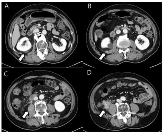 Axial, intravenous, contrast-enhanced CT scan of the abdomen (A–D) reveals an infiltrative-enhancing soft tissue mass in the terminal ileum. It also shows several enhanced soft tissue nodules in the right Gerota’s fascia, transversalis fascia, posterior pararenal fascia and right psoas muscle.