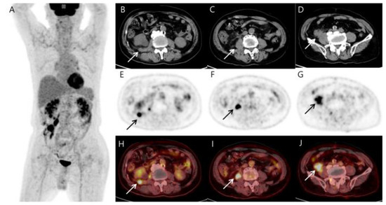 MIP (A), CT (B–D), PET (E–G), and fusion PET/CT (H–J) of the 18F-FDG PET/CT images reveal several hypermetabolic soft tissue nodules (arrows) involving the terminal ileum (SUVmax 17.87), right psoas muscle (SUVmax 14.87), and reptroperitoneum (SUVmax 12.22). The terminal ileal mass shows a comet-tail-like pattern of increasing absorption toward the back, suggesting invasion into the psoas muscle. Other than the above-described area, no significant abnormal findings in other parts of the body are included in the image. As shown in the MIP image, it differs too much from the typical prostate cancer metastasis that spreads from bottom to top along lymph nodes to be considered prostate cancer metastasis. Additionally, it is not appropriate to consider it a small intestinal adenocarcinoma and metastasis because the patient has no symptoms. The patient had previously been treated for lymphoma, and based on the 18F-FDG PET/CT findings, we first considered the possibility of recurrent lymphoma or sarcoma.